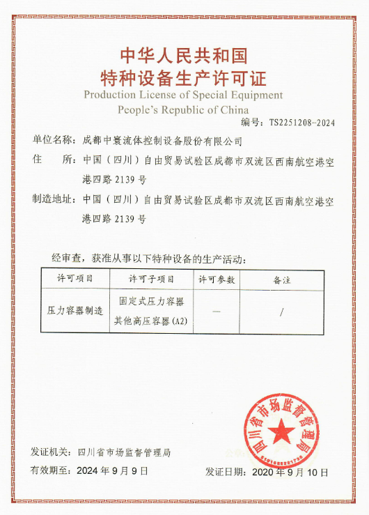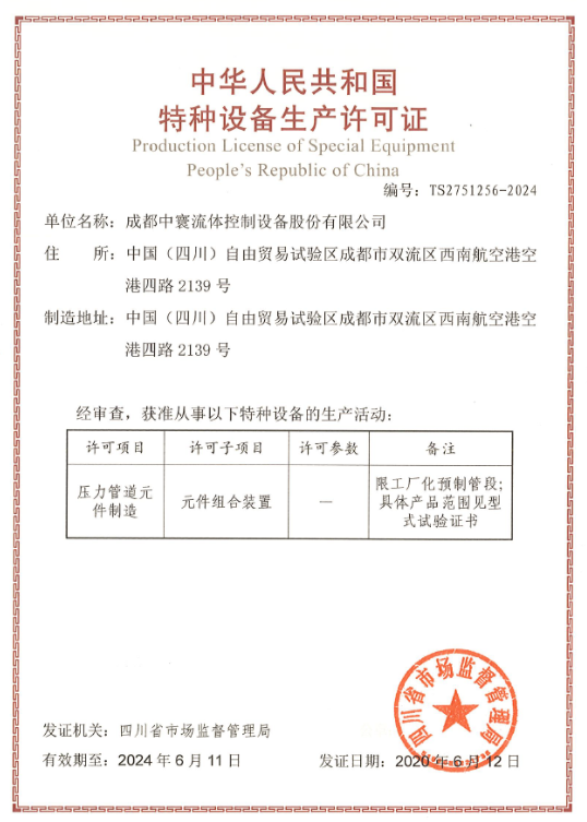 成都中寰流体控制设备股份有限公司分别在6月12日和9月10日取得了四川省市场监督管理局颁发的《中华人民共和国特种设备生产许可证(压力管道元件制造)》、《中华人民共和国特种设备生产许可证(压力容器制造)》,获准从事A2压力容器和压力管道元件组合装置(限工厂化预制管段)的制造。